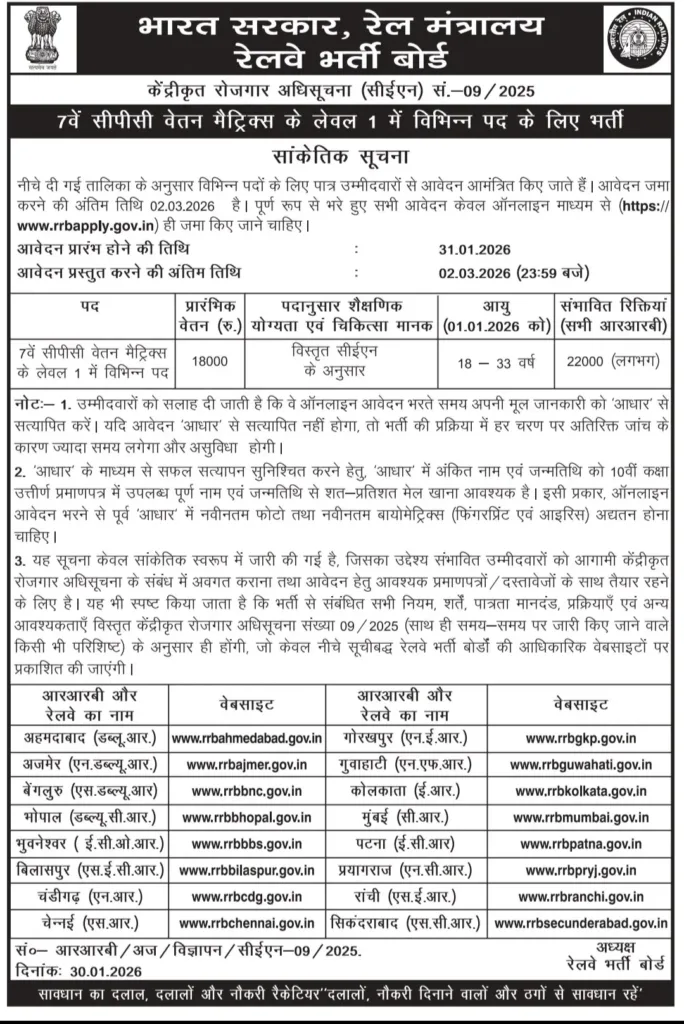 RRB Group D Notification 2026: The Railway Recruitment Board has stated that about 22000 new positions of Group D will open up in the year 2026. As per the latest notice, the dates of registration have been changed. The RRB Group D notification of CEN 09/2025 will be issued in details in January 2026, in all regional websites and registration will start on January 31, 2026, on the web site https://www.rrbapply.gov.in/)